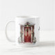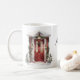 A caneca exclusiva apresenta uma encantadora porta da frente em aquarela adornada com folhagens natalinas, apresentando uma coroa feita de pinhas, frutas vermelhas e folhas no centro. Acima da porta, uma guirlanda da mesma folhagem cai em cascata pelas laterais, emoldurando a entrada com um laço vermelho profundo. A porta em si é uma tonalidade vermelha profunda e rica. Duas árvores verdes brancas geladas ficam altas em ambos os lados da porta. A cena é ambientada em um cenário de solo macio coberto de neve. O efeito geral é quente e convidativo, evocando o espírito aconchegante da temporada de festas para mostrar sua apreciação.