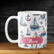 Esta caneca personalizada apresenta esboços lúdicos de veleiros, âncoras e faróis com texturas de aquarela pastel brilhantes em azul claro, lavanda e pêssego para preencher alguns elementos, adicionando uma estética tranquila e sonhadora.