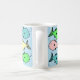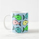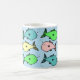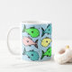 Ilustração colorida de peixe decora esta caneca de café. Uma ideia de presente para quem quer que mantenha peixes tropicais. Design de peixe tropical. Uma caneca desenhada atraente, decorada com um padrão de peixe colorido. Ideia para um dono de peixe tropical. Fundo azul claro.