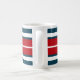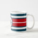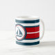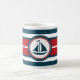 Design náutica com decoração em forma redonda de embarcações à vela, em fundo listrado vermelho, azul e branco