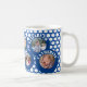 Dê a mamãe algo que ela vai gostar por anos! Polka personalizável - design de ponto apresenta fundo de bolinhas azul e branco em toda a caneca. De um lado há um quadrado azul mostrando seu texto em letras brancas e negrito. Do outro lado há locais para quatro fotos diferentes, que são exibidas dentro de quadros circulares azuis. Uma forma excelente de compartilhar suas memórias!