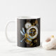 Marcações antigas com engrenagens de ouro e latão, decoradas com libélula mecânica sobre fundo castanho e listrado. Steampunk.