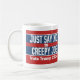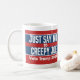 Esta caneca pró-Trump engraçada é excelente para o patriota conservador republicano apoiador Trump. "Apenas diga não ao Joe assustador" em azul empoeirado patriótico, vermelho e branco. Mostre seu apoio ao 45º presidente dos EUA com esta engraçada e humorística caneca de café, peça de conversa perfeita para colegas de trabalho e amigos no escritório ou ao redor da casa.