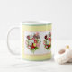 Que é mais macio e mais bonito do que um buquê de ervilhas doces do jardim? São caracterizados aqui em um fundo macio do amarelo da grão, aparado com rosa do escudo e sábio para uma caneca de café cerâmica bonito e macia.