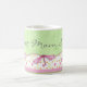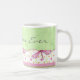 Esta linda caneca de aquarela apresenta um padrão de bolinhas verdes e brancas com uma borda de flores e libélulas. Personalize esta caneca com seu próprio texto ou compre como mostrado com "Melhor Mãe do Mundo"