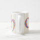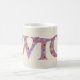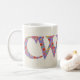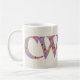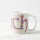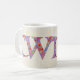 Uma caneca de café do divertimento com a palavra "cwtch" de Galês, significando o "afago" ou o "abraço", em um roteiro celta, encheu-se com um teste padrão floral bonito em um fundo do linho-olhar.