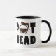 Caneca de café engraçada que diz: Cabeça do pote. O design da chalaça do pothead é uma palavra dobro-entendre que conduza nos acreditar que o proprietário da caneca é um amante recreacional das drogas, ou um amante do café. Ou ambos…