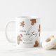 Pão de Gengibre Festivo Bonito, Pão de Café. Design apresenta um clássico fundo branco, decorado com pão-de-açúcar e biscoitos-gengibre, de cor aquosa, com alguns vestindo um chapéu de Papai Noel vermelho. O doce ditado "Gingerbird kisses and Holiday Wish" e o nome da família.