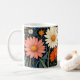 Grandes e belas margaridas em rosa, vermelho-tijolo e branco, sobre um fundo escuro com pequenas flores ouros, tornam esta caneca perfeita para qualquer um que ama a natureza e as flores.