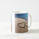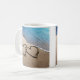 Linda, original, foto profissional de dois corações escritos ou desenhados na areia ao longo da água azul do oceano para significar amor e romance em uma caneca de café. Conceito de excelente para Dia de os namorados, evento de aniversário e casamentos de praia de verão.