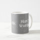A caneca de cinza clara com textura branca de um platter diz Trabalhando Duro de um lado, e dificilmente Trabalhando no outro.