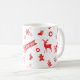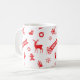Uma caneca de Natal com repetição contínua de elementos de Natal - meias, gingerbreadman, flocos de neve, renas, Enfeites de natal, velas, árvore de Natal e as palavras "Feliz Natal" - em ilustração.