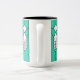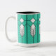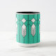 Esta caneca tem um design de diamantes e linhas em branco, preto e turquesa, com janela de vidro colorido.