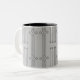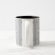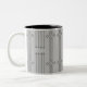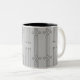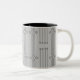 Esta caneca tem um design de arte de linhas verticais com ouros e círculos em prata em um campo de cinza.