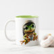Whimsical green frog in a space helmet cups steaming coffee, blending cosmic charm with cozy cafe vibes. Bold colors and glossy helmet create playful wearable appeal.