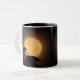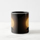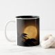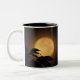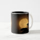 É outono, e uma lua de cheio amarela ouro luminosa subiu atrás das silhuetas pretas de folhas soprando na brisa desta dramática caneca de fotografia de arte. O fundo é iluminado em tons de laranja, ouro e marrom para criar um padrão de abstrato num motivo asiático. O design é repetido nos lados direito e esquerdo.