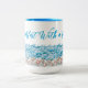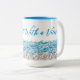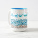 Beach coffee mug with seashells and ocean waves design. Customize the script in sea blue color, "Breakfast with a view" is the sample saying, which you may change. Shown on the taller 15oz. mug or choose the smaller size. This style has a matching blue interior color.