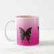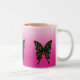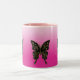 Impressão de três borboletas grandes pretas e douradas sobre um fundo de gradiente rosa.