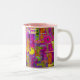 Café ou chá da bebida? Tente esta caneca bonito e colorida de flower power de dois tons! Esta caneca descreve uma imagem de minha colagem dos meios mistos de flower power em um lado, e é colorida cor-de-rosa no interior. Caracteriza mão colorida uma flor tirada e um pássaro amarelo bonito com pés listrados preto e branco longos. Estes caráteres sentam-se sobre um fundo de vários papéis e pinturas decorativos coloridos no rosa, no roxo e na laranja. Como um brilho final do toque floresce e diferente colora borboletas terminam a parte.