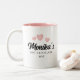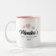 Na moda Elegante Cama Motivacional Cuta que inclui moderna tipografia, com o nome personalizado script Hot Chocolate Mug com corações cor-de-rosa fofinhos e ilustração de duas xícaras no verso. Faz um presente de feriado de amor para qualquer garota, filhos, netos, família e amigos. Esta caneca será perfeita como presente personalizado para casamentos, aniversários, dia da mãe, presente de Dia de os namorados e outros eventos.