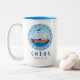 Chios, Grécia caneca de duas cores com um desenho de um navio grego antigo e letras em estilo grego. Este desenho de navio da Grécia Antiga tem a chave grega em um desenho circular com o mar e o céu. Este desenho em estilo grego torna esta caneca um presente ideal ou lembrança ou para beber café enquanto você está de férias em Chios.