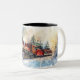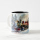 Celebrate the magical and festive holiday season with our personalized photo mug. Our vintage holiday design features a farm landscape of Christmas trees, this Christmas pattern features a farm Christmas scene with a farm, a red barn, children playing and throwing snowballs, Christmas trees and a red vintage truck