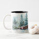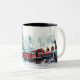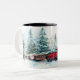 Celebrate the magical and festive holiday season with our personalized photo mug. Our vintage holiday design features a farm landscape of Christmas trees, this Christmas pattern features a farm Christmas scene with a farm, a red barn, children playing and throwing snowballs, Christmas trees and a red vintage truck