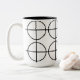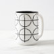 Círculos Pretos e Brancos Rasgam Mug Geométrica de Café de Dois Toneladas, projetada por Nisha Prabhu CuteHomeGifts. Meio século moderno de design com círculos preto e branco com faixas verticais horizontais a preto sobre fundo branco.