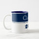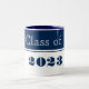 A classe de Formando da caneca de café é mostrada num design de cores azul e branca marinho. Texto: Classe de 2023.