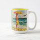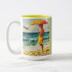 CLASSY SASSY E uma caneca de presente SMART-ASSY para aquele amigo perfeito. Uma jovem na praia segurando um guarda-chuva solar. Um ponto central com o texto.
