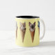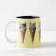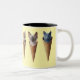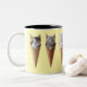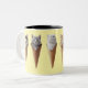Seis raças de gatos grudados de cones de sorvete estão circulando um copo de café.