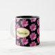 Foto de uma flor do cosmos púrpura com um recorte central amarelo e colocada sobre fundo preto e impressa numa caneca. Você pode mudar a cor de fundo para o que quiser. Personalize com seu nome ou outro texto usando os vários estilos de fonte e cores que o Zazzle tem para oferecer. Essas canecas vêm em vários tamanhos e estilos. Esta foi uma foto tirada no jardim de um amigo em Massachusetts. Direitos autorais originais de 2008 por Karen Cofsense.