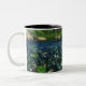 Uma cena submarina dividida com um vale verde acima e as profundezas frias de um rio rochoso montanhoso abaixo. Raios do Sol dançam através da água e cardumes de natação de prata entre as pedras e ervas daninhas do leito do rio.