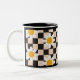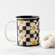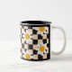 Daisy Coffee Mug com fundo de prancha de xadrez em cores amarelo, branco e preto.