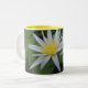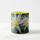 Duas lírios brancas com lindos centros amarelos. O café perfeito ou a caneca de chá para alguém que ama flores.