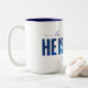 A caneca de café é mostrada em branco e marinho em azul, com uma Escritura riscada. Personalize este item ou comprar como está. Imagem licenciada