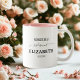 Mostre seu apreço às madrinhas maravilhosas com esta sofisticada caneca preta de café. Beleza personalizada na fonte moderna "Morgana Script" com seu nome, é um presente chico e prático que eles apreciarão. Perfeito por beber a sua bebida favorita enquanto se preparava ou como uma encantadora saquê. O perfeito acessório elegante para uma proposta de dama de honra ou Bachelorette!