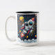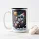 Uma nave de foguetes retrô se transforma em um cosmos colorido e estrelado. É desenhado brincalhão com grandes olhos e um rosto amigável, adicionando um toque de chorona à cena. A trilha de exaustão do foguete e os planetas vibrantes ao fundo criam um sentido de movimento dinâmico e aventura.