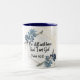 Flores azuis tostadas e um quadro de ouro encerram a bela escritura Psalm 46:10 nesta caneca de dois tons; pronta para as suas manhãs silenciosas de café com Jesus.