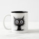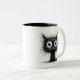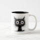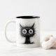 Um gato preto muito desajeitado, com globos oculares sangrando.