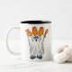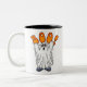 Um pequeno fantasma vestindo calçados e texto cor de laranja que diz "BOO" aparece no truque do Halloween ou trata sacos de tote, T-shirts, canecas, botões e outros itens temáticos do fantasma.