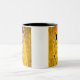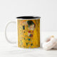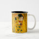 Café Mug com pintura a óleo de Gustav Klimt com folha de ouro The Kiss (1908). Um homem e uma mulher, vestindo cores ouros brilhantes, adoravelmente abraçando e beijando num campo de flores. Um presente de excelente para fãs de Arte Nouveau e de Arte Austríaca.