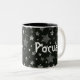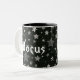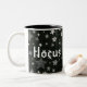Este Halloween Mug tem um fundo estrelado e o texto Hocus de um lado e Pocus do outro.