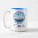 Ithaca, caneca de café de duas tonalidades Grécia com um design de um antigo navio grego e letra grega. Esta Grécia da antiga nave design tem a chave grega em um design de círculo com o mar e o céu. Este design de estilo grego faz desta caneca um presente ou lembrança ideal ou para beber café enquanto você está de férias na ilha de Ithaca.