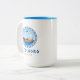 Litochoro, Grécia caneca de duas cores com um desenho de um navio grego antigo e letras em estilo grego. Este desenho de navio da Grécia Antiga tem a chave grega em um desenho de círculo com o mar e o céu. Este desenho em estilo grego torna esta caneca um presente ideal ou lembrança ou para beber café enquanto você está de férias em Litochoro.
