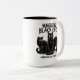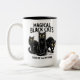 Magical Black Cats two-tone coffee mug design by Banzai Kat. Why settle for a regular security system when you can have three black felines with attitude? This coffee mug features the elite, supernatural guarding team you didn't know you needed. They don't just ward off evil spirits; they also specialize in aggressively judging your life choices, knocking fragile items off shelves to test gravity, and ensuring no ghost ever sleeps through a 3 AM zoomie session. Sleek, sassy, and slightly chaotic—these three black cats are ready to protect your home from bad vibes (and maybe, occasionally, the irritating boy friend). Enjoy your coffee or tea in it to let the world know you are under the protection of the dark side... and it’s very fluffy.