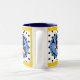 Mágica caneca de férias com a variação original de Jewbilee de um elf de Maxfield Parrish anterior à WWI com leggings brancas e negras de bolinhas+a menorah em seu calçado+saudando "Happy Hanukkah" em medalhão de saltos, fundo de bolinhas e bordas amarelas ensolaradas.