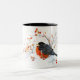 A neve adiantada trava um pisco de peito vermelho americano enquanto forrageia na fruta de uma videira agridoce.