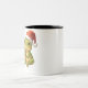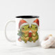 This illustration features two cute frogs wearing Santa hats and holding a Christmas gift, drawn in a warm and friendly style perfect for the festive season.