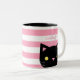 Uma caneca super fofa com listras cor-de-rosa e brancas, e um gato preto adorável com olhos amarelos.